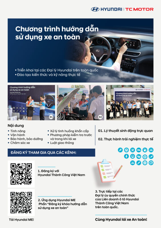 Công ty Cổ phần Liên doanh Ô tô Hyundai Thành Công Việt Nam phối hợp cùng hệ thống Đại lý ủy quyền trên toàn quốc tổ chức thường xuyên chương trình Hướng dẫn sử dụng xe an toàn với các hoạt động đào tạo song song thực hành thực tế nhiều chủ đề thực tiễn, cần thiết khi sử dụng xe Hyundai và lưu thông trên đường. Chúng tôi mong muốn trang bị cho Qúy khách hàng những kiến thức bổ ích và mang đến những trải nghiệm thú vị nhất.