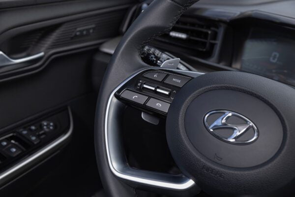Phần đầu xe sở hữu lưới tản nhiệt hình lục giác lớn, được bao quanh bởi hai thanh ngang mạ crôm. Cụm đèn pha LED được thiết kế theo phong cách “Parametric Hidden Lights”, mang phong cách thiết kế của mẫu SUV Tucson với các đường nét sắc sảo và tinh tế