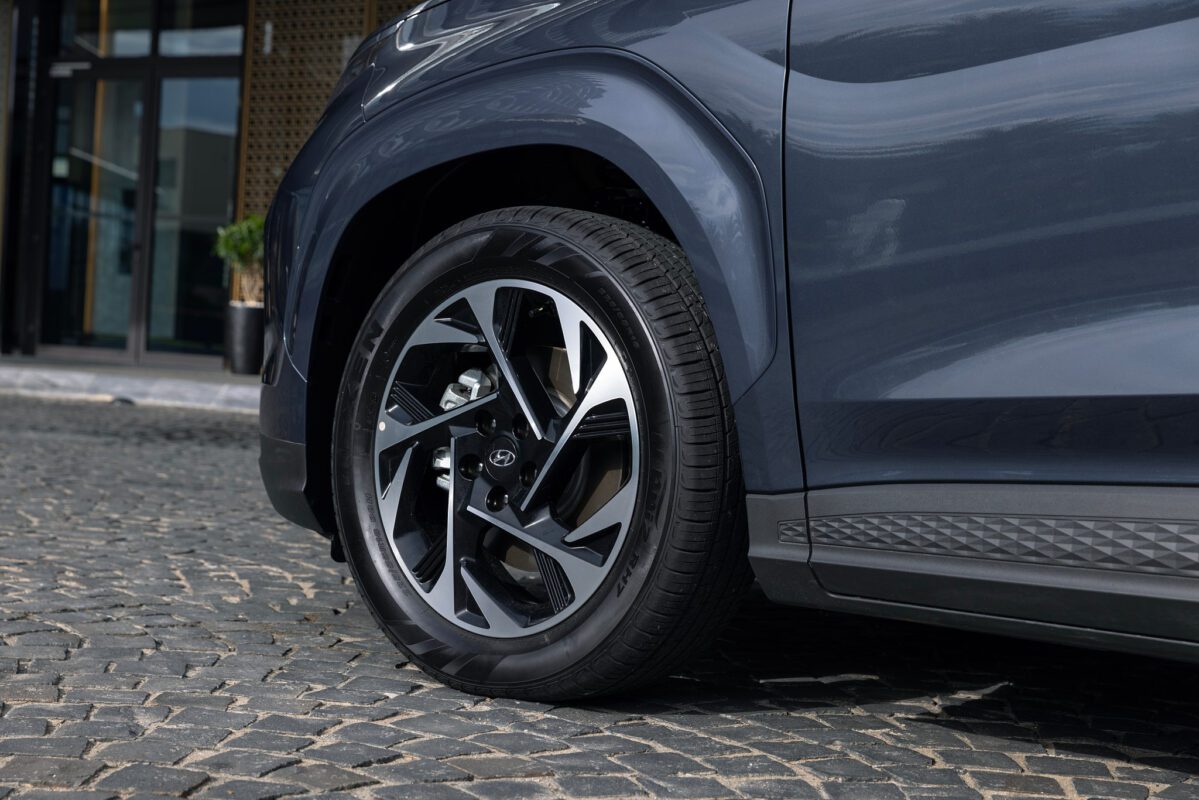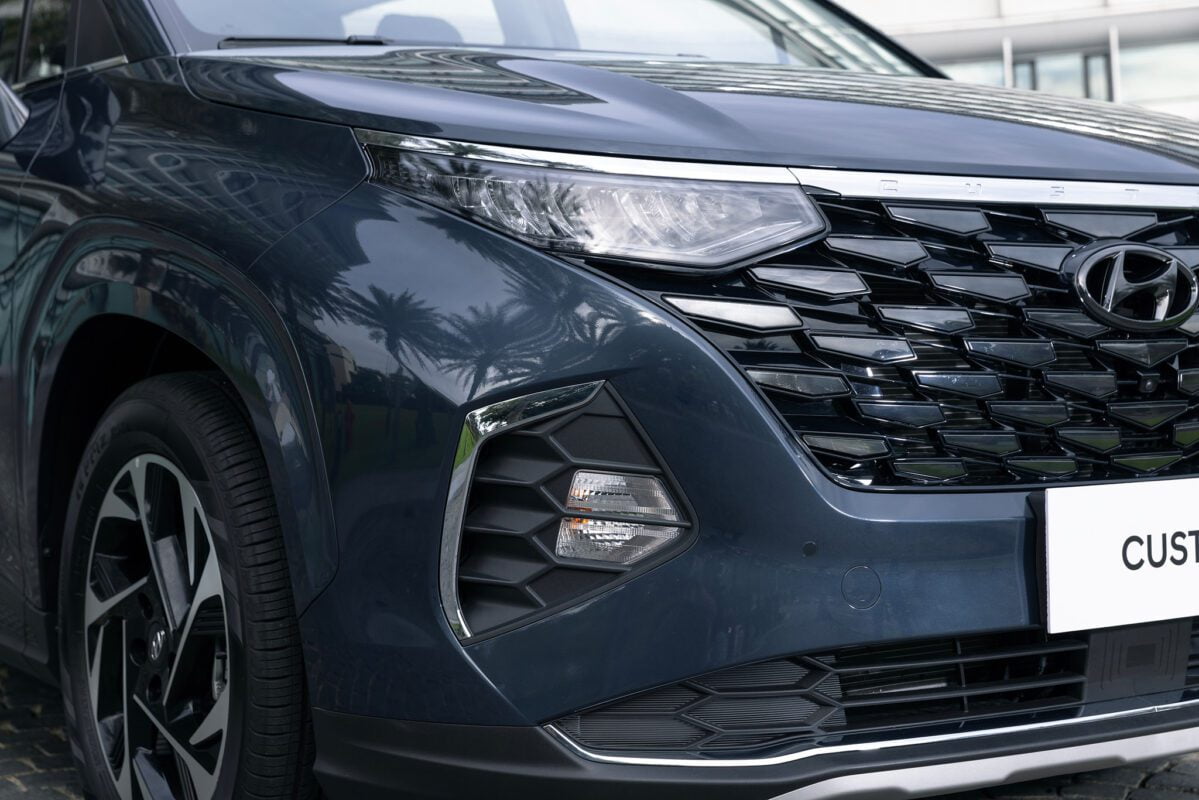 Phần đầu xe sở hữu lưới tản nhiệt hình lục giác lớn, được bao quanh bởi hai thanh ngang mạ crôm. Cụm đèn pha LED được thiết kế theo phong cách “Parametric Hidden Lights”, mang phong cách thiết kế của mẫu SUV Tucson với các đường nét sắc sảo và tinh tế